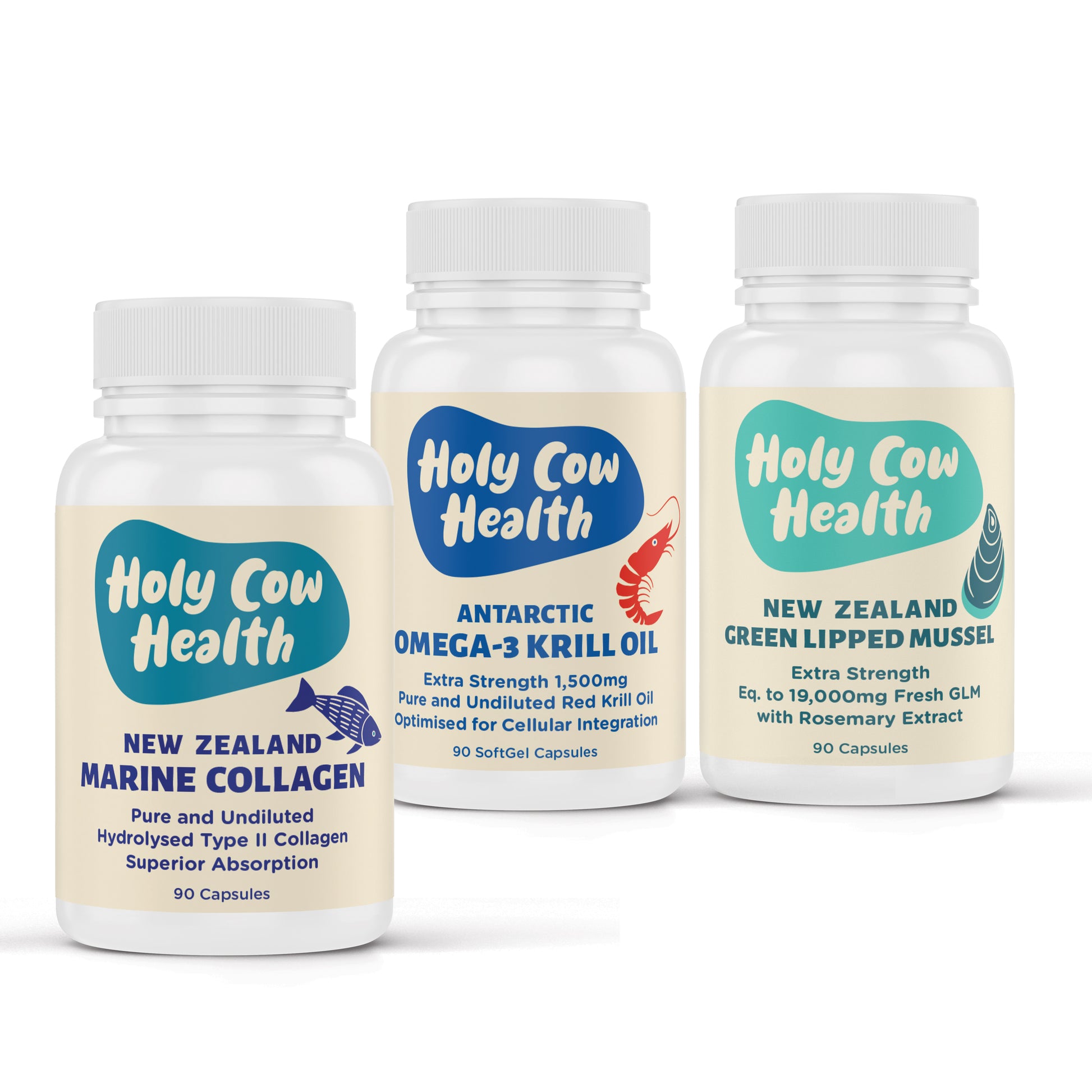 Discover the natural science of wellness with Holy Cow Health’s Anti-Inflammation Pack. Formulated with New Zealand Marine Collagen, Green Lipped Mussel, and Antarctic Red Krill Oil, this powerful trio supports the body’s natural anti-inflammatory processes while promoting joint health, skin vitality, and overall wellbeing.