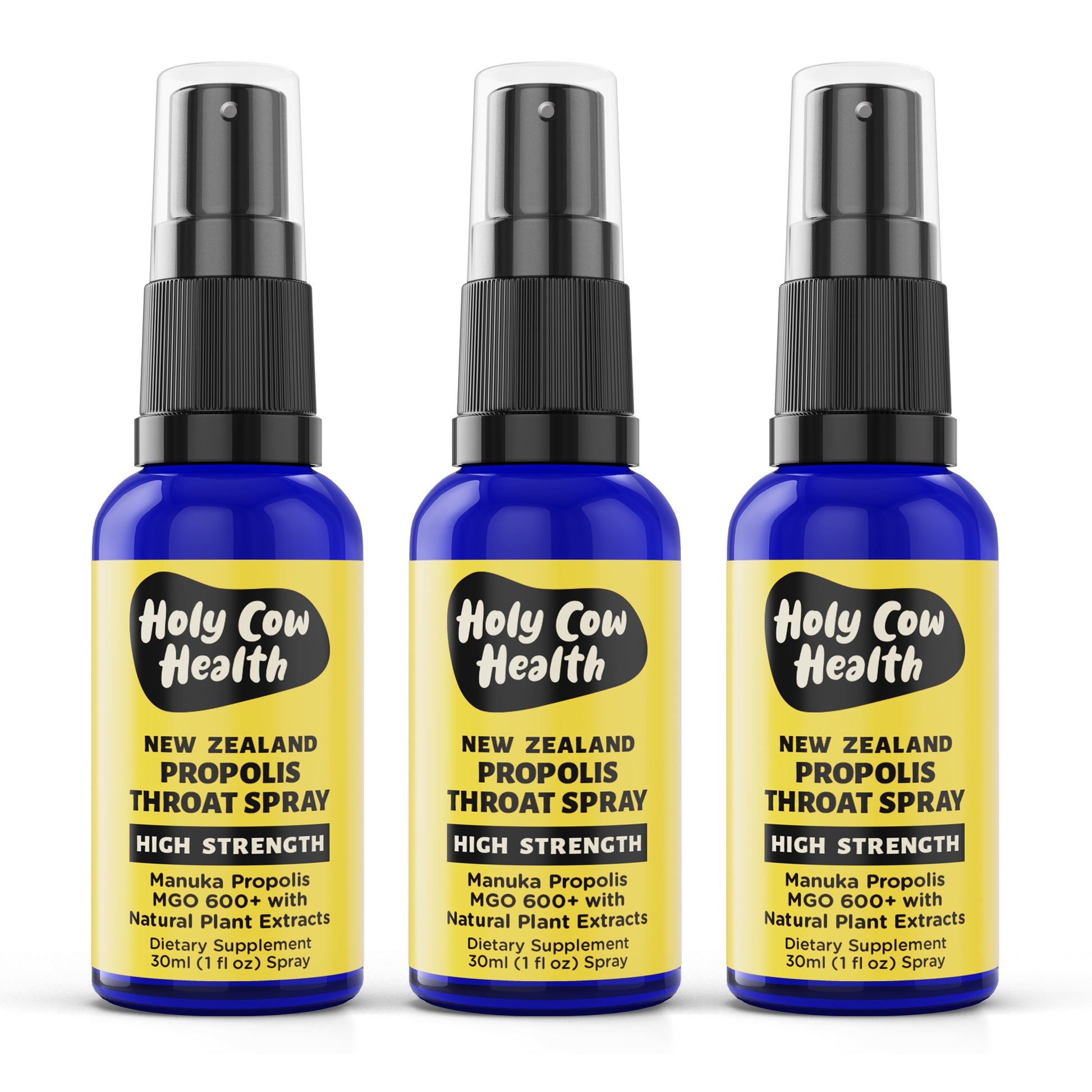Holy Cow Health Propolis Throat Spray is a high-strength, on-the-go solution made with New Zealand Propolis and Manuka Honey (MGO 600+), and a premium blend of essential oils.