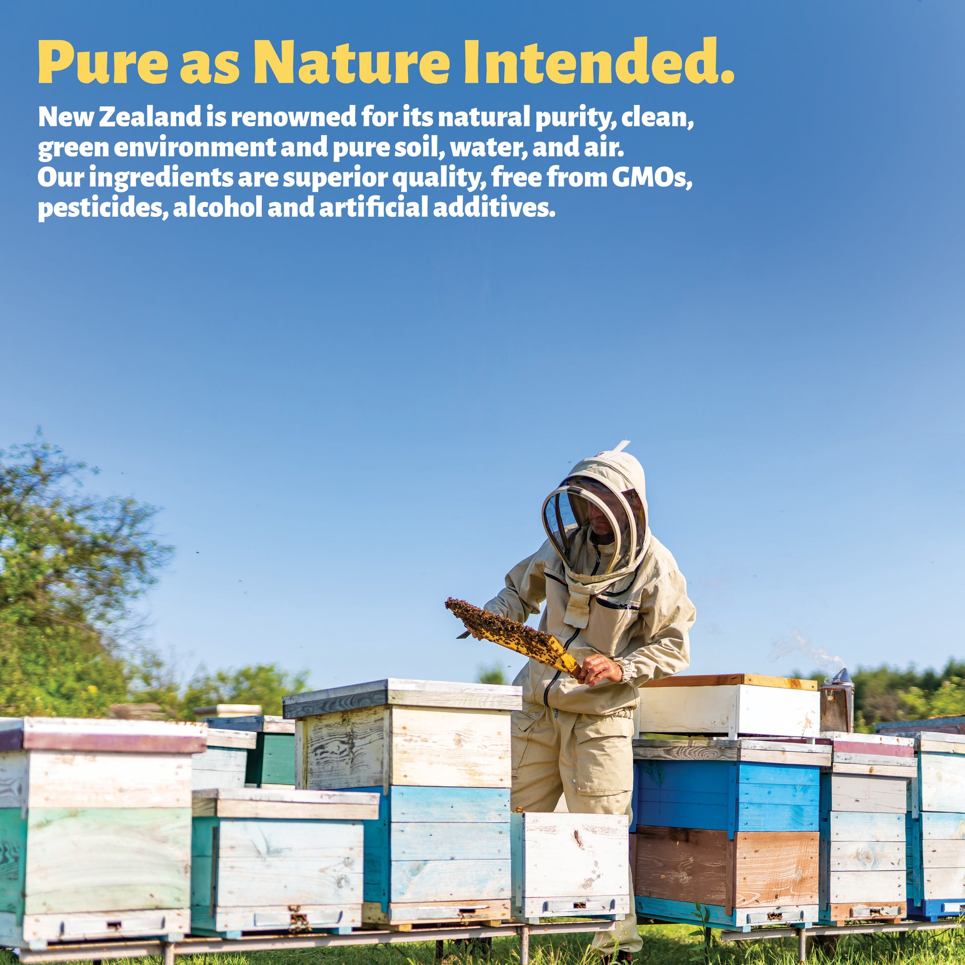 Free from alcohol, pesticides, GMOs, and artificial additives. Not recommended for individuals allergic to bees or bee products.