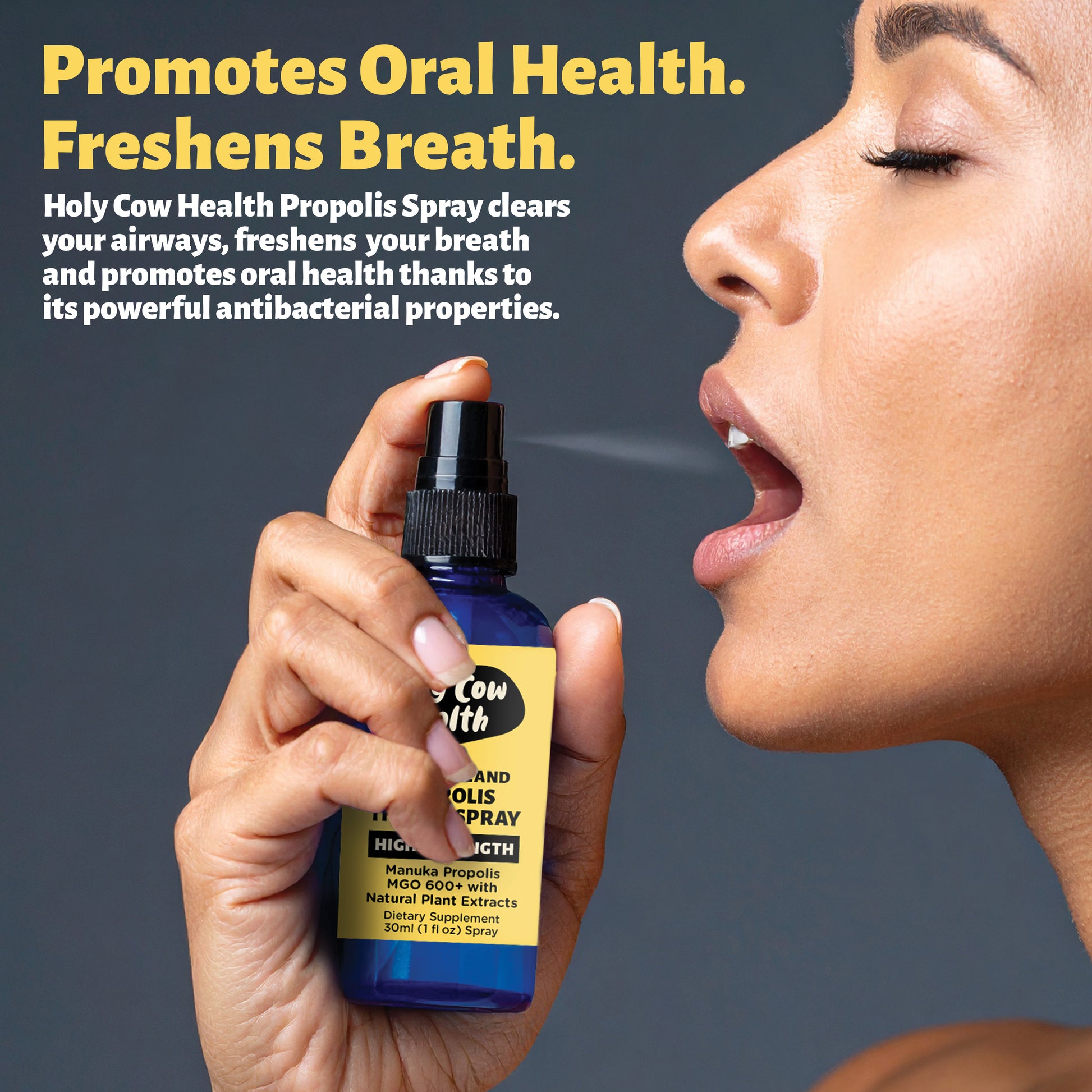 Holy Cow Health Propolis Throat Spray is a high-strength, on-the-go solution made with New Zealand Propolis and Manuka Honey (MGO 600+), and a premium blend of essential oils.